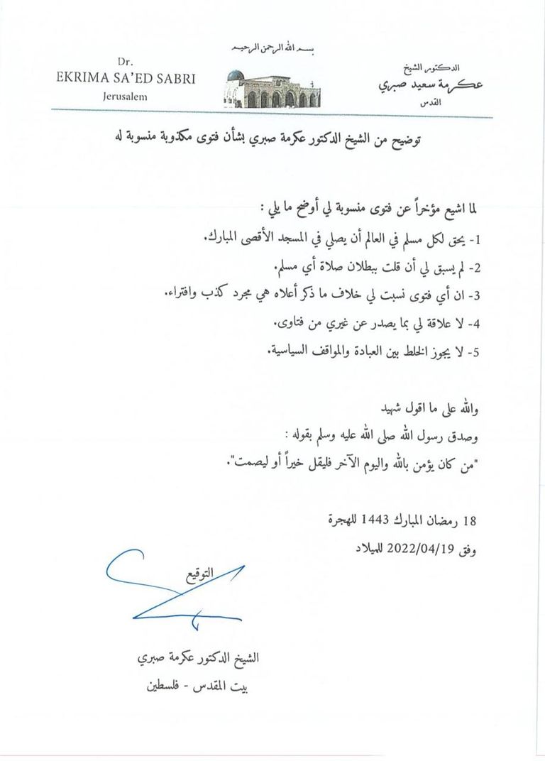 ونقلت وسائل إعلام عربية بيانا صادرا عن مفتي الديار الفلسطينية السابق، الشيخ عكرمة صبري، قال فيه: "يحق لكل مسلم في العالم أن يصلي في المسجد الأقصى المبارك".