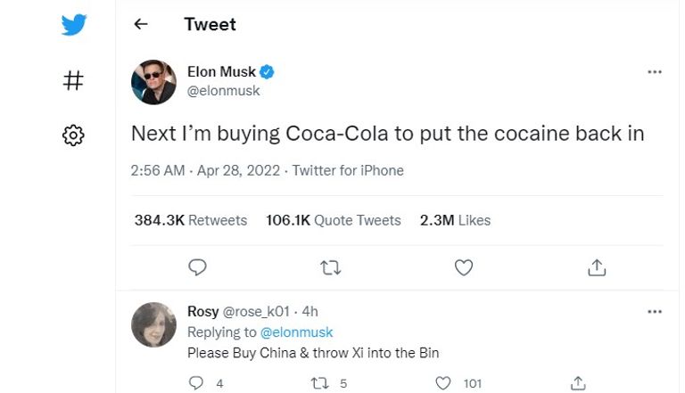 ويبدو أن هذه التغريدة جاءت في إطار ساخر فالكوكايين محظور قانونا، كما أن ماسك قال في تغريدة أخرى بعد وقت وجيز: "لنجعل توتير أقصى درجة من المتعة".