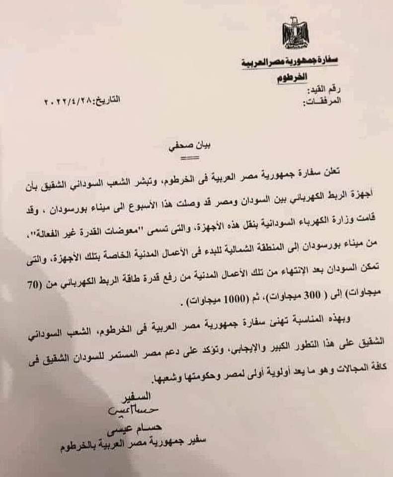 "متن نيوز" حصلت على وثيقة تتمثل في خطاب أعلنت عنه سفارة مصر في السودان تؤكد وصول المعدات اللازمة للبدء في تنفيذ مشروع الربط الكهربائي بين مصر والسودان.