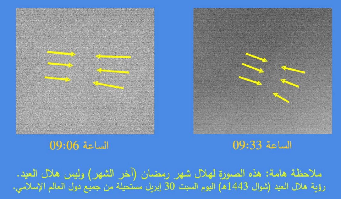 نشر مركز الفلك الدولي صورة هلال آخر الشهر (رمضان 1443هـ) كما تم تصويره نهارا قبل قليل من أبوظبي وبصعوبة، بواسطة مرصد الختم الفلكي التابع لمركز الفلك الدولي.