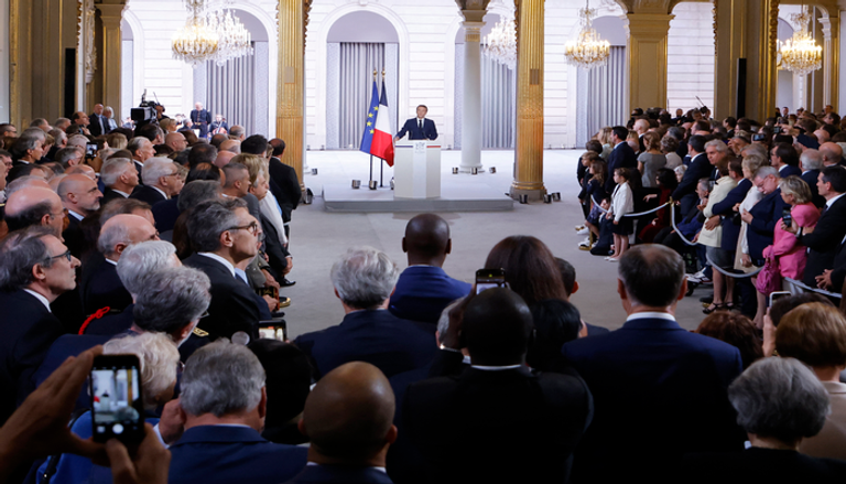 ولاحقا، ألقى ماكرون كلمة أمام نحو 450 شخصية مدعوة وأفراد عائلته من بينهم زوجته بريجيت وأصدقاء وأعضاء الحكومة ورئيس الوزراء جان كاستكس فضلا عن كبار المسؤولين في مجلسي البرلمان وممثلين عن الجامعات والنقابات والأديان وغيرهم.