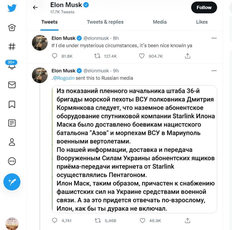 وفي تغريدة أخرى لماسك تضمنت صورة مما قاله روغوزين عن تزويد ماسك لأوكرانيا بنظام ستارلينك للإنترنت عبر الأقمار الصناعية مجانا.