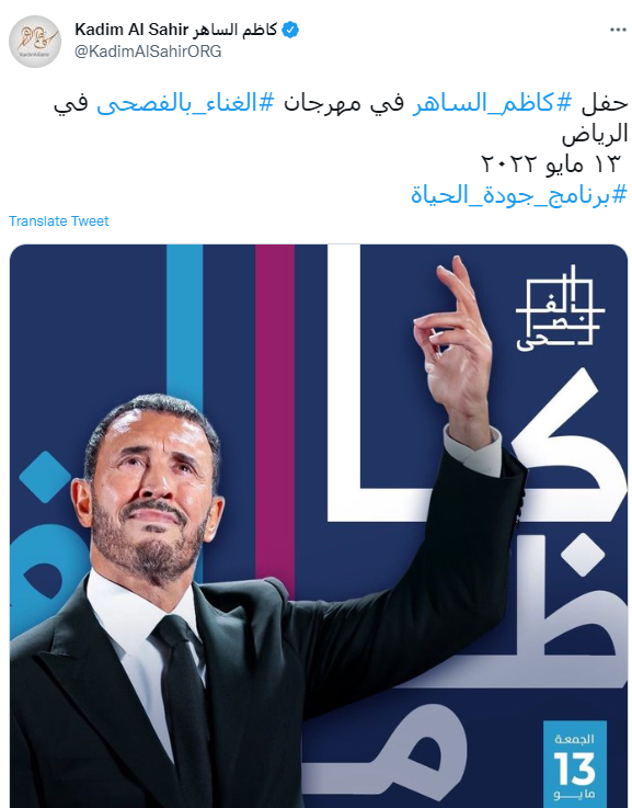 يستعد المطرب كاظم الساهر لحفله الجديد، حيث من المقرر أن يحيي حفلا غنائيا في الرياض ضمن مهرجان الغناء بالفصحي، وذلك 13 من الشهر الجاري، حيث نشر كاظم بوستر الحفل من خلال حسابه على توتير وعلق عليها بـ " حفل كاظم الساهر في مهرجان الغناء بالفصحى في الرياض١٣ مايو 2022".