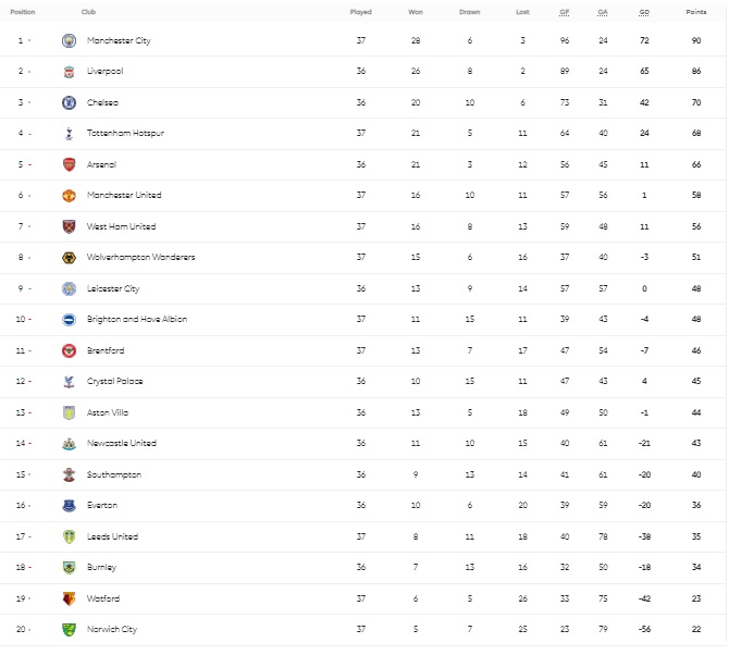 ويحتل تشيلسي المركز الثالث برصيد 70 نقطة، من 36 مباراة، ثم توتنهام برصيد 68 نقطة، بعد فوزه الصعب على ضيفه فريق بيرنلى بهدف نظيف سجله هارى كين.