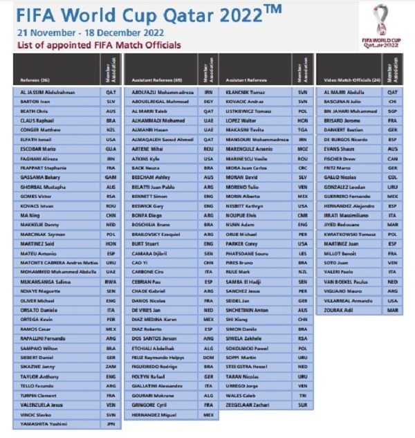 كشف الاتحاد الدولي لكرة القدم "الفيفا" اليوم الخميس عن أسماء الحكام الذين سيديرون مباريات في كأس العالم لكرة القدم 2022.