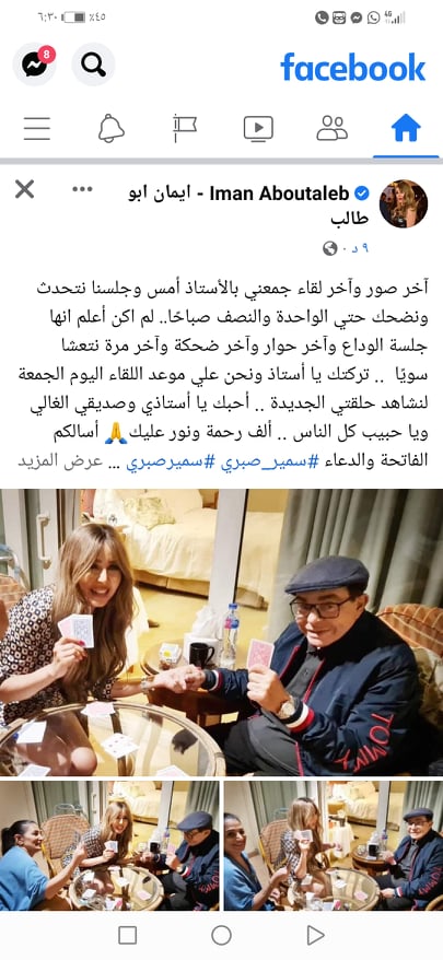 وكتبت ايمان تدوينة عبر صفحتها بموقع التواصل الاجتماعي فيس بوك قالت فيها: "آخر صور وآخر لقاء جمعني بالأستاذ أمس وجلسنا نتحدث ونضحك حتي الواحدة والنصف صباحًا.. لم اكن أعلم إنه ا جلسة الوداع وآخر حوار وآخر ضحكة وآخر مرة نتعشا سويًا .. تركتك يا أستاذ ونحن علي موعد اللقاء اليوم الجمعة لنشاهد حلقتي الجديدة.. أحبك يا أستاذي وصديقي الغالي ويا حبيب كل الناس.. ألف رحمة ونور عليك أسالكم الفاتحة والدعاء".