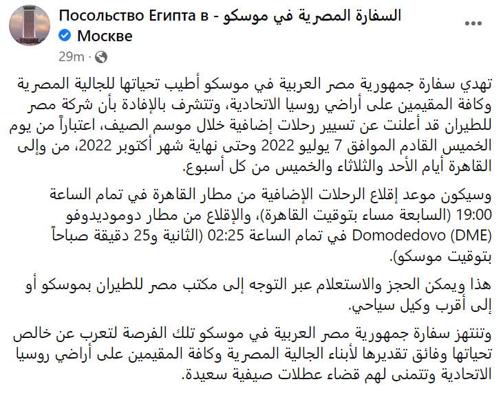وحول هذا الامر قالت السفارة المصرية في موسكو: تهدي سفارة جمهورية مصر العربية في موسكو أطيب تحياتها للجالية المصرية وكافة المقيمين على أراضي روسيا الاتحادية.