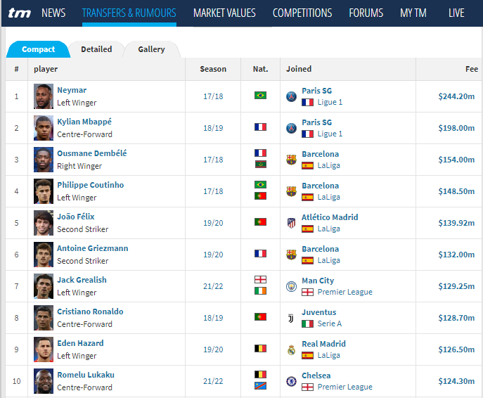 وفقا للتقرير فق جاء في الصفقات الأغلى يتصدر البرازيلي نيمار حيث تصدر البرازيلي نيمار في صفقة انتقاله من برشلونة الإسباني إلى باريس سان جيرمان الفرنسي، عام 2017، بـ 222 مليون يورو 231 مليون دولار.