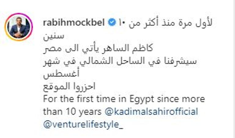 يعقد المغني العراقي كاظم الساهر حفل في الأيام المقبلة بجمهورية مصر العربية.