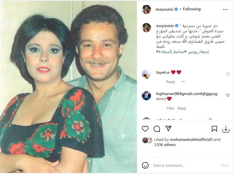 وعلقت الاعلامية المصرية إسعاد يونس على الصورة المنشورة بـدي صورة من مسرحية سيدة الوحوش، خدتها من صديقي المؤرخ الفني محمد شوقي، وكانت بطولتي مع حبيبي فاروق الفيشاوي الله يسعد روحه في الجنة"
