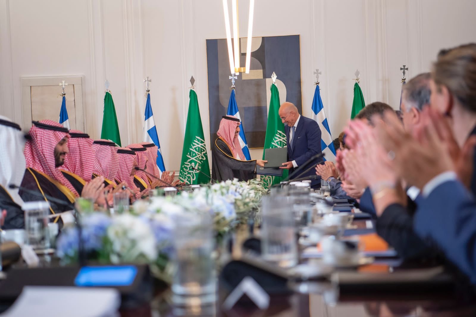 وأضاف الأمير محمد بن سلمان، "سنساعد اليونان على إنشاء شبكة الربط الكهربائي، وسنبحث سبل التعاون في مجال مشروعات الهيدروجين الأخضر".