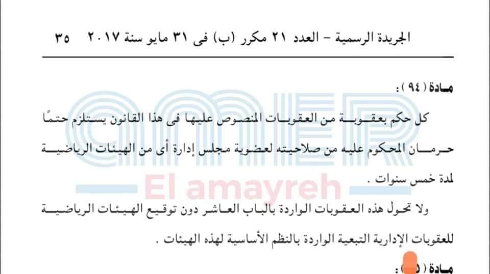وتنص المادة 94 من قانون الرياضة رقم 71 لسنة 2017 على: "كل حكم بعقوبة من العقوبات المنصوص عليها فى هذا القانون يستلزم حرمان المحكوم عليه من صلاحيته لعضوية مجلس إدارة أى من الهيئات الرياضية لمدة 5 سنوات".