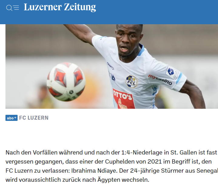 كشفت صحيفة لوزيرن زيوتينج السويسرية، عن إتمام نادي الزمالك المصري للتعاقد مع النجم السنغالي إبراهيما نداي لاعب فريق لوزيرن السويسري.