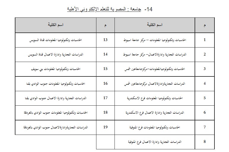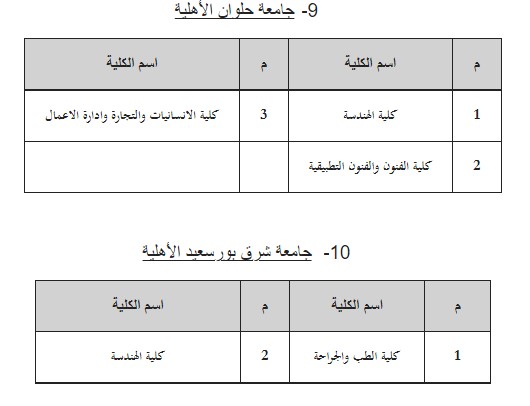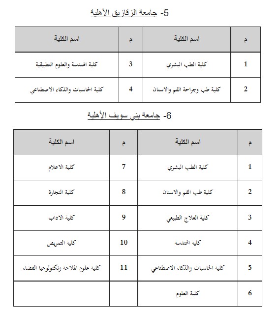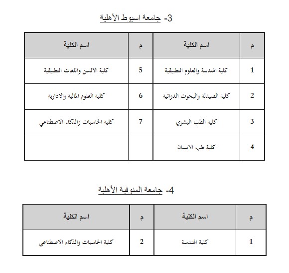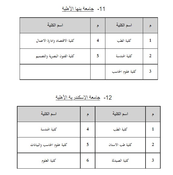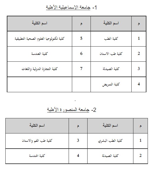 وأشارت الوزارة إلى قبول الطلاب بكليات هذه الجامعات الأهلية وترشيح الطلاب بها في مرحلة تنسيقية مستقلة وفقا للحد الأدنى المقرر.