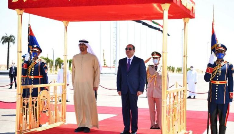 وكان الرئيس المصري في مقدمة مستقبلي، الشيخ محمد بن زايد آل نهيان، لدى وصوله إلى مطار العلمين.