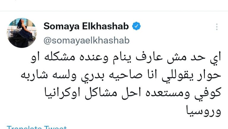 حيث غردت الفنانة المصرية سمية الخشاب إلى متابعيها عبر "تويتر" قائلة: حد مش عارف ينام أو عنده مشكلة أو حوار يقوللي أنا صاحية بدري ولسه شاربه كوفي ومستعدة أحل مشاكل أوكرانيا وروسيا".
