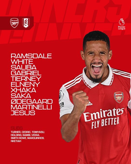 أعلن ميكيل أرتيتا المدير الفني لنادي أرسنال الإنجليزي، تشكيلة فريقه فى اللقاء الذى سيجمعه مع فولهام، فى السادسة والنصف مساء اليوم السبت، على ملعب "الإمارات"، ضمن منافسات الجولة الرابعة من الدوري الإنجليزي الممتاز، ويبدأ محمد الننى أساسيا مع أرسنال للمرة الأولى خلال الموسم الحالى فى الدوري الإنجليزي.