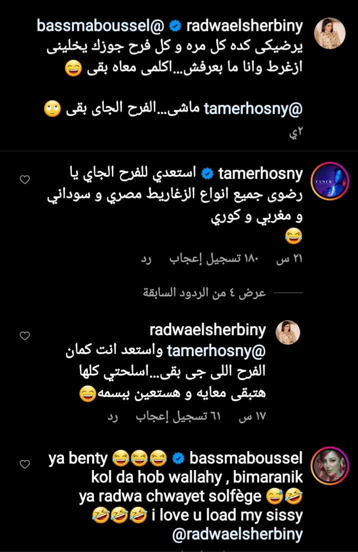 وردت الإعلامية المصرية رضوي الشربيني عليه قائلة: واستعد انت كمان الفرح اللي جاي بقي.. اسلحتي كلها هتبقي معايا وهستعين ببسمة، لترد عليها بسمة عبر التعليقات قائلة: "يا بنتي كل ده حب والله، بيمرنك يا رضوى، كل الحب ليكي".