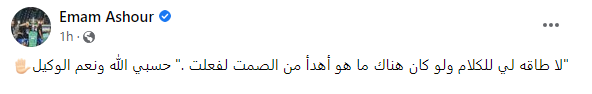 جاء ذلك مع حلول نهاية الدوري الممتاز الذي توّج به الزمالك حيث كتب النجم إمام عاشور عبر فيس بوك: لا طاقة لي للكلام ولو كان هناك ما هو أهدأ من الصمت لفعلت.. حسبي الله ونعم الوكيل.