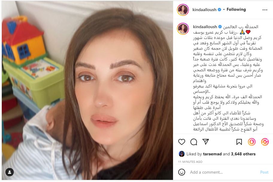 و قالت النجمة كندة علوش خلال حسابها الشخصى بموقع تبادل الصور وافيديوهات "انستجرام"، "الحمدلله رب العالمين رزقنا بكريم عمرو يوسف".