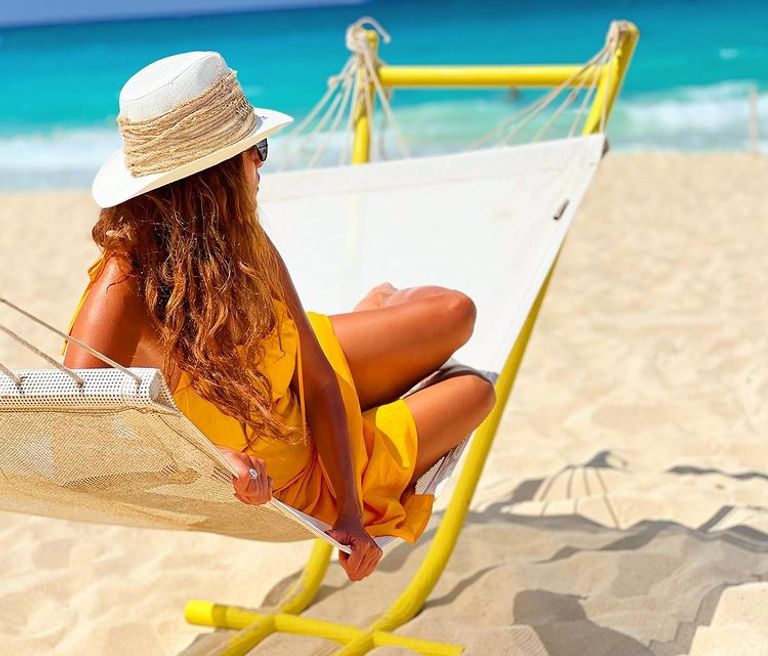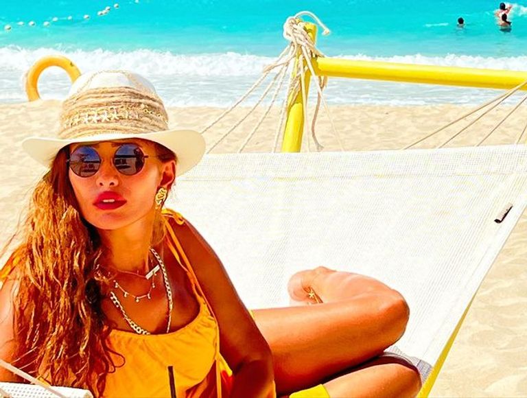 وارتدت الفنانة المصرية "كاش مايوه" أصفر اللون، ونسقت معه قبعة أوف وايت ونظارة شمسية سوداء.