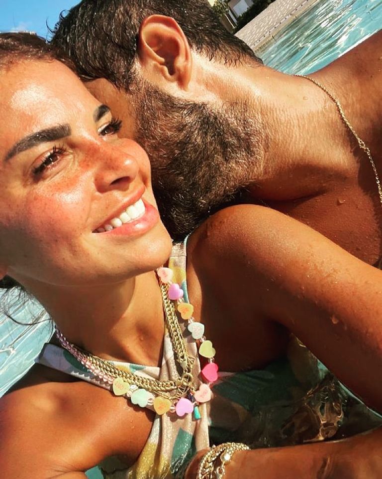 حيث ظهر الفنان كريم فهمي في الصورة وهو يقبل زوجته داخل حمام السباحة، في لقطة علق عليها بقوله: أنا لحبيبي".