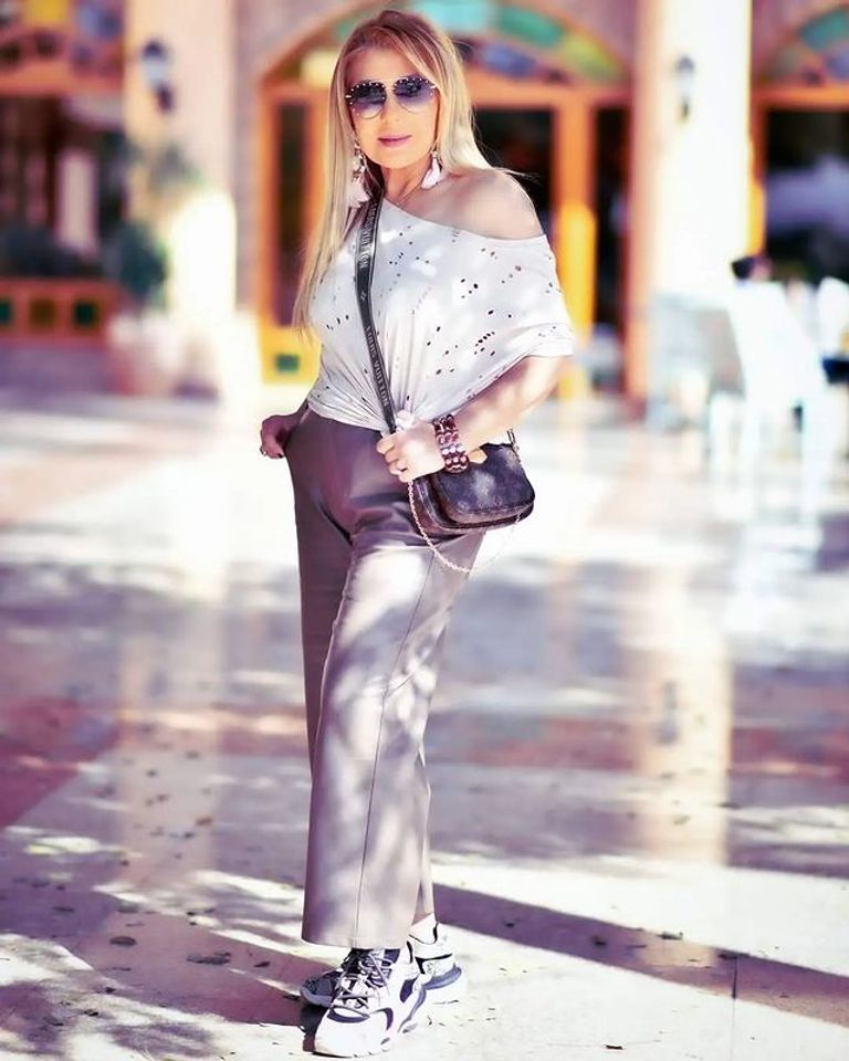 حيث ظهرت نادية الجندي بإطلالة شبابية، إذ ارتدت ملابس تكشف عن كتفها، إضافةً إلى حذاء رياضي "كوتشي"، ونظارة شمسية.