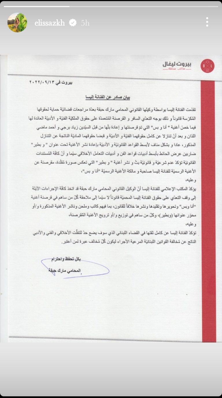 وجاء نص البيان كالتالي: "تقدمت الفنانة إليسا بواسطة وكيلها القانوني المحامي مارك حبقة، بعدة مراجعات قضائية حماية لحقوقها، وذلك عقب التعدي السافر، والقرصنة المعتمدة التي حدثت على حقوق الملكية الفنية فيما يخص أغنية (أنا وبس)، التي تمت قرصنتها وبثها من قبل زياد برجي وأحمد ماضي، اللذان تنازلا عن كامل حقوقهما الفنية وحصلا على حقوقهما المادية".