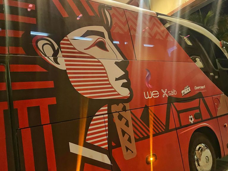 كما كتب على الحافلة الجديدة اسم المنتخب المصري لكرة القدم ولقب الفراعنة، مع صور لشخصيات فرعونية وصورة كرة.