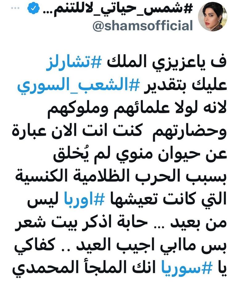 واختتمت حديثها: فيا عزيزي الملك تشارلز، عليك تقدير الشعب السوري لأنه لولا علماؤهم وملوكهم وحضارتهم لكنت أنت الآن عبارة عن حيوان منوي لم يُخلق بعد بسبب الحرب الظلامية الكنسية التي كانت تعيشها أوروبا ليس من بعيد، حابة أذكر بيت شعر بس ما أبي أجيب العيد... كفاكي يا سوريا أنك الملجأ المحمّدي.
