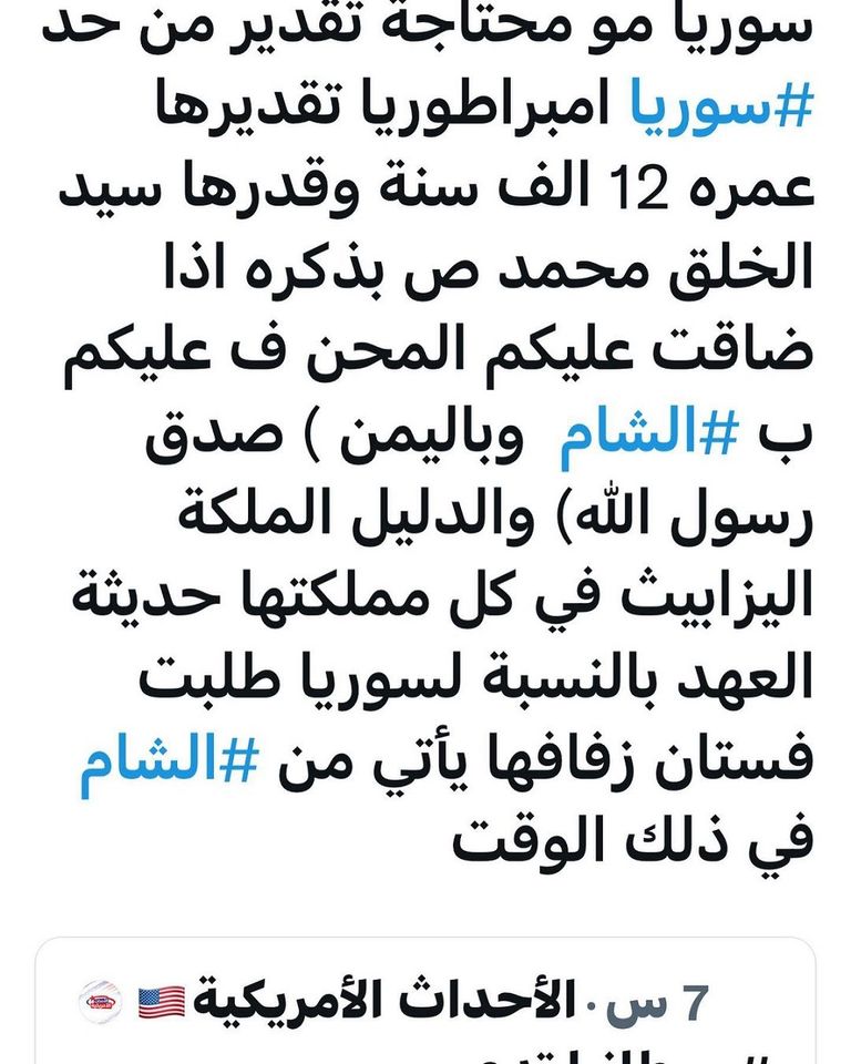 وقالت الفنانة شمس، في منشورات عبر "إنستجرام": “سوريا مو محتاجة تقدير من حد، سوريا إمبراطورية عمرها 12 ألف سنة وقدّرها سيد الخلق محمد ”صلى الله عليه وسلم" بذكره "إذا ضاقت عليكم المحن فعليكم بالشام وباليمن".
