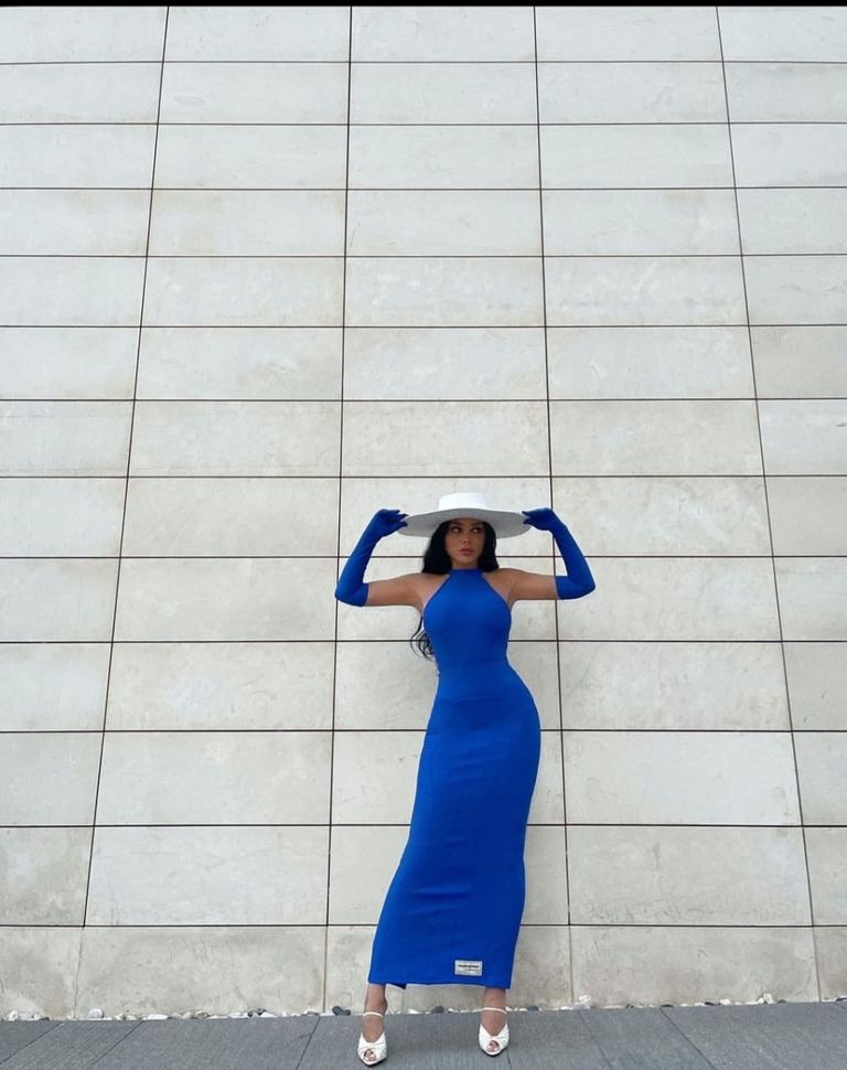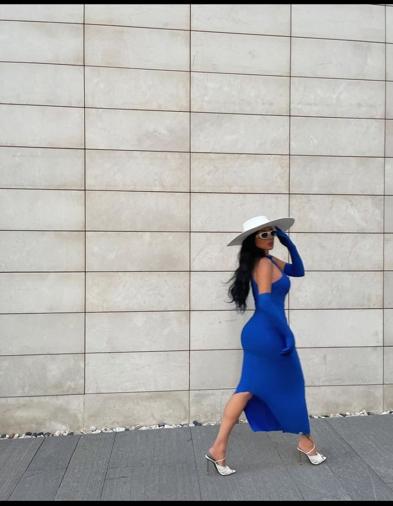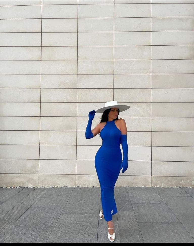 حيث جاءت إطلالة هيفاء وهبي بفستان أنيق باللون الأزرق الزهري ونسقت معه حذاء باللون الأبيض وقبعة كبيرة من نفس اللون.
