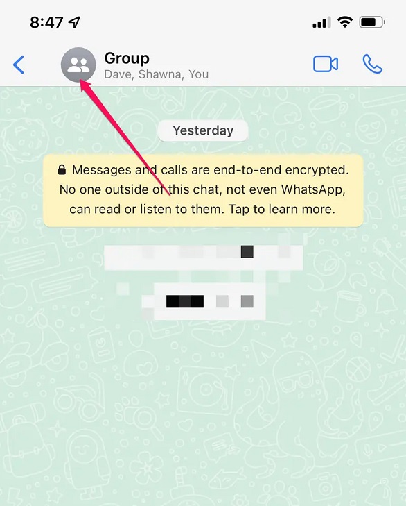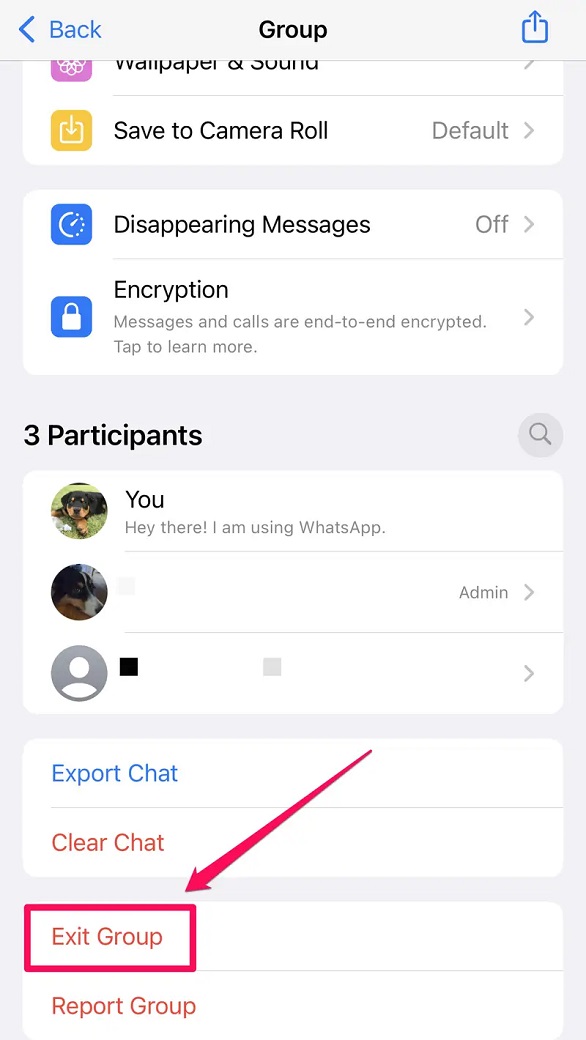 في البداية ففي واتس آب، انقر علامة التبويب الدردشات في أسفل الصفحة، وفي قائمة الدردشات، انقر المجموعة التي تريد مغادرتها.