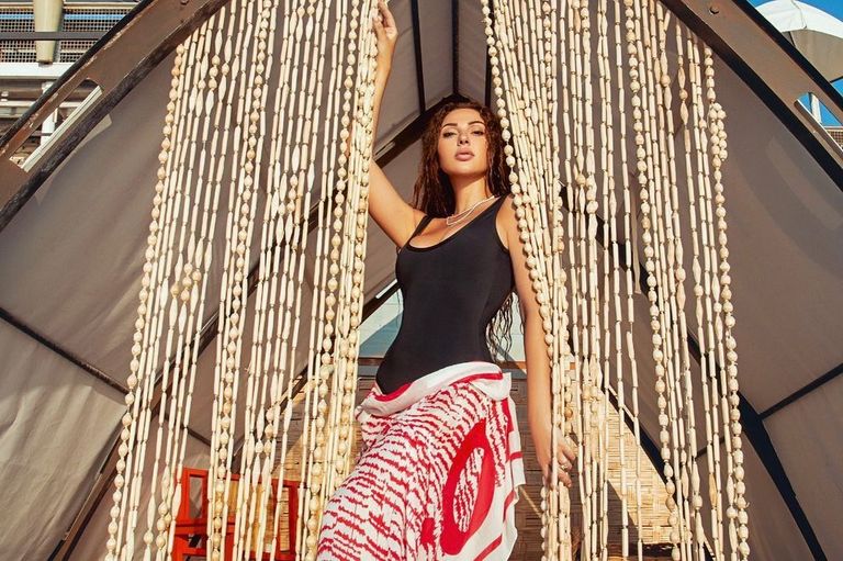 حيث ارتدت مريام فارس في الصور التي نشرتها عبر حسابها الرسمي على موقع إنستجرام، مايوه باللون الأسود كشف المنطقة العليا من جسدها بشكل ملفت، وزينت إطلالتها بكاش مايوه من اللونين الأبيض والأحمر.