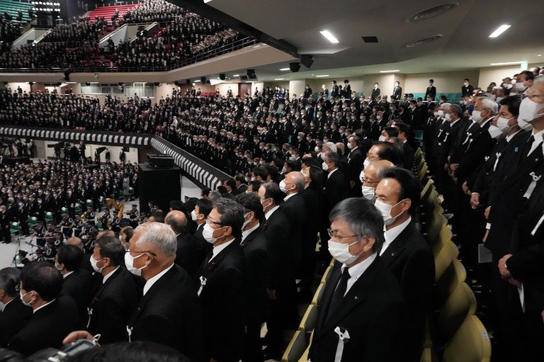 حيث بدأت المراسم في الساعة الثانية بعد الظهر بالتوقيت المحلي (05:00 بتوقيت غرينتش)، حيث حملت أرملته آكي رماد آبي إلى قاعة نيبون بودوكان، بوسط طوكيو لتنطلق أنغام الموسيقى من فرقة عسكرية وتدوي طلقات تحية حرس الشرف.