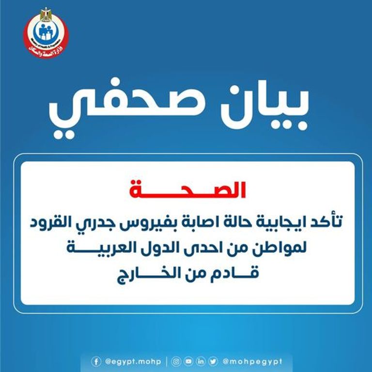 وقالت الوزارة المصرية، في بيان، إنه "تم ثبوت إيجابية مريض من إحدى الدول العربية مصاب بفيروس جدري القرود قادم من الخارج يوم ٢٥ سبتمبر الجاري".