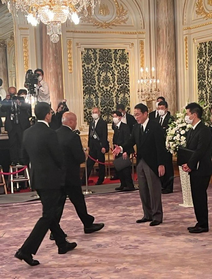 على صعيد متصل، وفي أعقاب ختام فعالية الجنازة شهد قصر Akasaka قيام كل من رئيس الوزراء الياباني "فوميو كيشيدا" ومعه أمين عام مجلس الوزراء "هيروكازو كاتسونو" ووزير الخارجية "يوشيماسا هاياشي" بتحية الوفد المصري، حيث قام الأول بتوجيه الشكر للمشاركة المصرية الرسمية في الجنازة، وكذلك قامت السيدة حرم رئيس الوزراء الأسبق "آبى" بتحية الوفد المصري، حيث أعرب السيد وزير النقل عن خالص عزاء القيادة المصرية وشعب وحكومة مصر في وفاة "آبى" الذي كان زعيمًا استثنائيًا لليابان وصديقًا حقيقيًا لمصر، والتأكيد على عمق الروابط التي تجمع بين الجانبين.