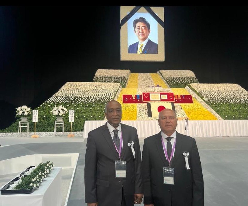 وقام السيد وزير النقل ومعه السفير المصري بالمشاركة في تأبين رئيس الوزراء الراحل خلال المراسم الجنائزية التي شهدت مشاركة وفود رسمية من حوالي 217 دولة وإقليم ومنظمة دولية، وبحضور ما يفوق ستة آلاف شخص، سواء من داخل اليابان أو خارجها.