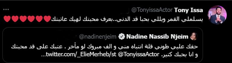 كما رد عليها طوني بتغريدة قال فيها: "يسلملي القمر ويللي بحبا قد الدني.. بعرف محبتك لهيك عاتبتك".