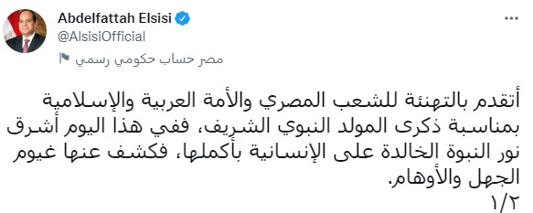 وكتب الرئيس المصري على تويتر: أتقدم بالتهنئة للشعب المصري والأمة العربية والإسلامية بمناسبة ذكرى المولد النبوي الشريف، ففي هذا اليوم أشرق نور النبوة الخالدة على الإنسانية بأكملها، فكشف عنها غيوم الجهل والأوهام.