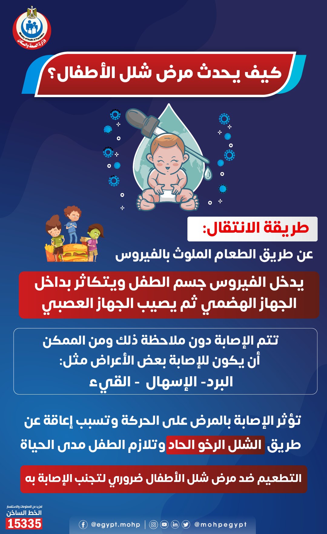 وفي ذات السياق كانت قد أوضحت وزارة الصحة في منشور لها على فيس بوك، بالتزامن مع انطلاق حملة تطعيم ضد شلل الأطفال 2022، أن شلل الأطفال ينتقل عن طريق الطعام الملوث بالفيروس، إذ يدخل الفيروس إلى جسم الطفل ويتكاثر في الجهاز الهضمي ثم يصيب الجهاز العصبي.