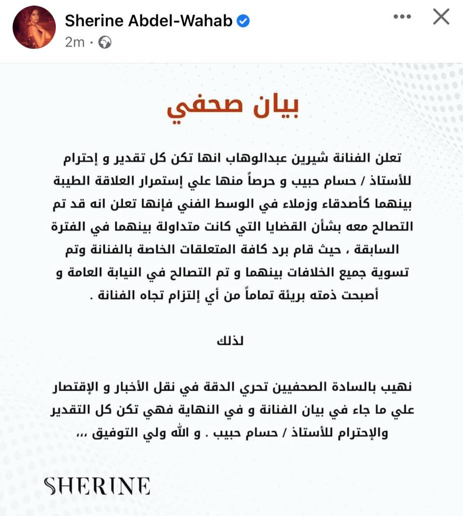 وقالت شيرين في البيان الصادر عنها أنها الان تكن كل التقدير والاحترام إلى الفنان حسام حبيب، مؤكدة "إنه حرصًا منها على استمرار العلاقة الطيبة بينهما كأصدقاء وزملاء، في الوسط الفني فإنها تعلن أنه قد تم التصالح معه بشأن القضايا، التي كانت متداولة بينهما، في الفترة السابقة، حيث قام برد كل المتعلقات الخاصة بالفنانة، وتم تسوية جميع الخلافات بينهما".