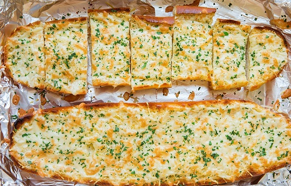 - يتم تقطع الخبز المصنوع من الحبوب الكاملة نصفين ويوضع خليط الثوم بالفرد في كل نصف، ثم يوضع الخبز في الفرن حتى يأخذ اللون الذهبي.