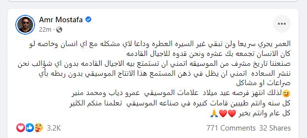 وكتب عمرو مصطفى، قائلا:" العمر يجري سريعا ولن تبقي غير السيرة العطرة وداعا لأي مشكله مع أي إنسان وخاصه لو كان الإنسان تجمعه بك عشره ونحن قدوه للأجيال القادمة".