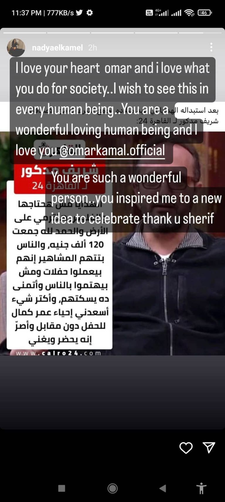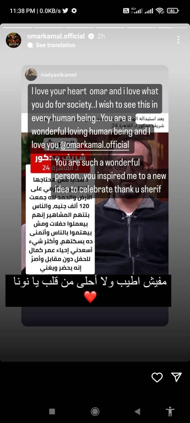 وجاء ذلك بعد إحياء عمر كمال حفل عيد ميلاد الإعلامي المصري شريف مدكور بالمجان لصالح إحدى المبادرات الخيرية.