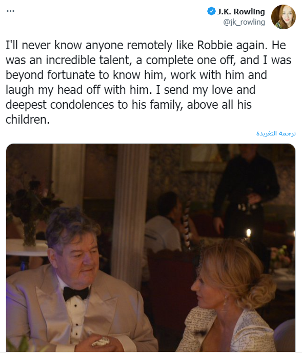 حيث أعربت الكاتبة البريطانية الشهيرة جى كى رولينج، مؤلفة سلسلة روايات وأفلام هاري بوتر، عن حزنها الشديد لوفاة الممثل الاسكتلندي روبي كولتراين.