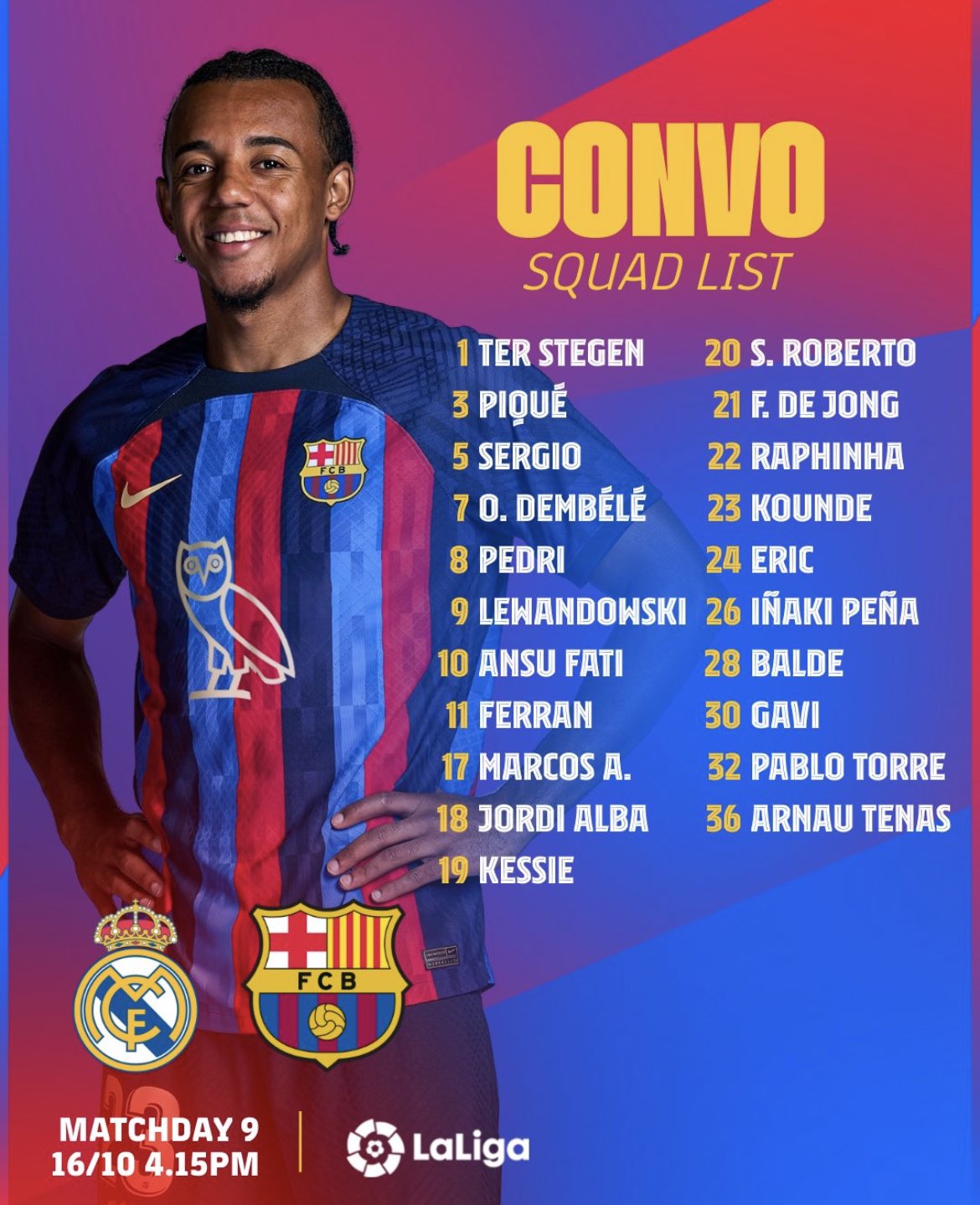 كشف تشافى هيرنانديز المدير الفنى لفريق برشلونة، عن القائمة التى سيخوض بها كلاسيكو الأرض أمام غريمه التقليدى ريال مدريد.