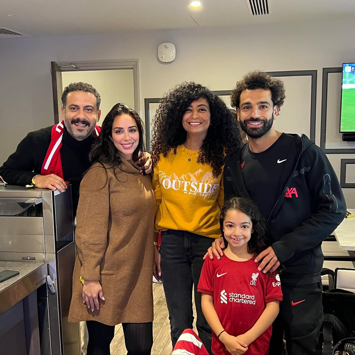 ونشرت بسنت شوقى، مجموعة من الصور برفقة محمد فراج من داخل الملعب، وصورة تجمعهما مع محمد صلاح، وابنته مكة، وعلقت بسنت على الصورة، "مع الملك وابنته".