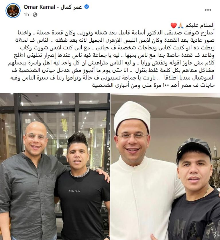حيث نفى مؤدي المهرجانات المصري عمر كمال، وكتب عبر صفحته الرسمية بـ "فيسبوك": "السلام عليكم.. أمس شاهدت صديقي الدكتور أسامة قابيل بعد الفروغ من عمله وتشرفت بلقائه في جلسة جميلة، التقطنا في نهايتها صورًا عادية".