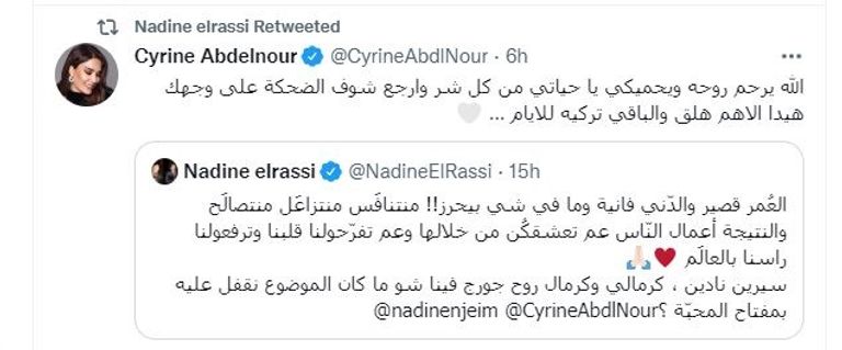 تغريدة نادين الراسي حظيت برد من سيرين عبد النور، التي كتبت: "الله يرحم روحه ويحميكي يا حياتي من كل شر وارجع شوف الضحكة على وجهك هيدا الاهم هلق والباقي اتركيه للأيام".